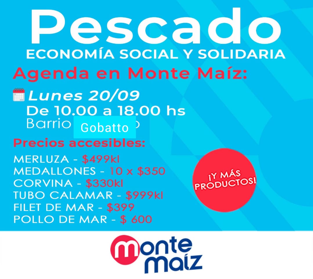 Llega el Plan Federal de Ferias a Monte Maíz y en el comienzo del mismo se venderá pescado a precios populares en distintos lugares de nuestra localidad. En B° Gobato, parquecito de San Luis y Neuquén; em B° Barracas, plaza San Cayetano y en el Paseo de la Hermandad.