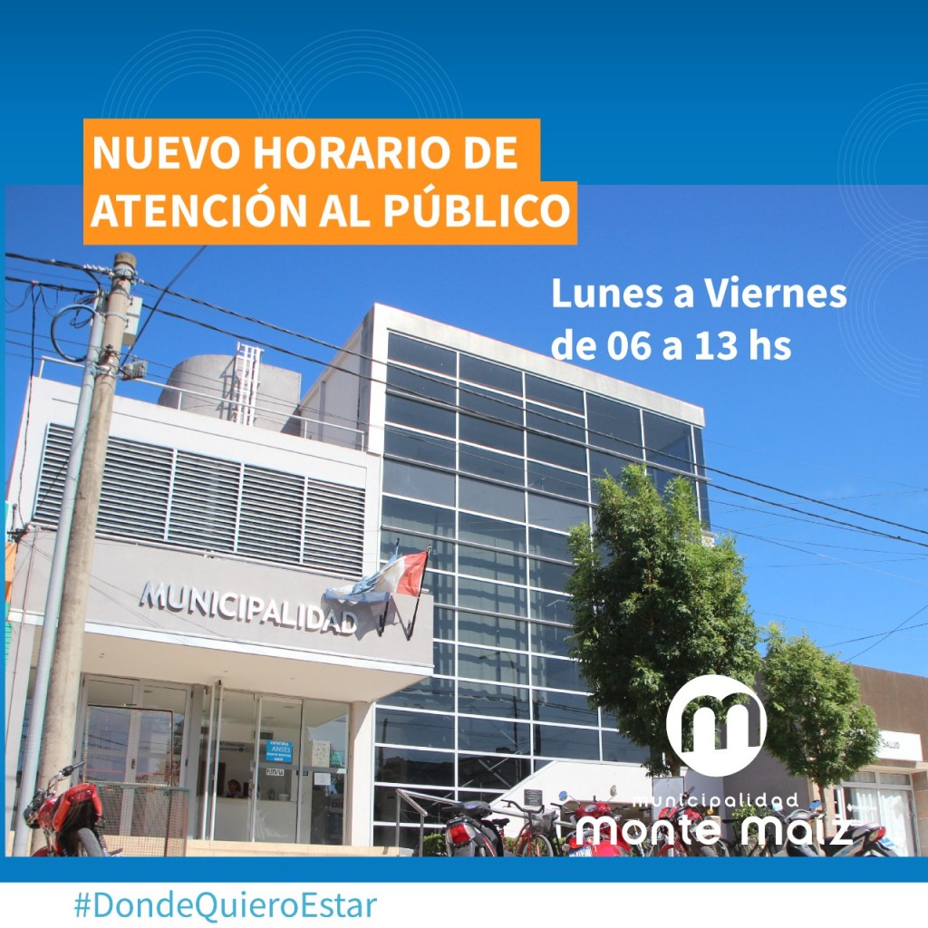 La Municipalidad de Monte maíz informa a la población que el nuevo horario de atención al público es de lunes a viernes de 06:00 a 13:00 hs.