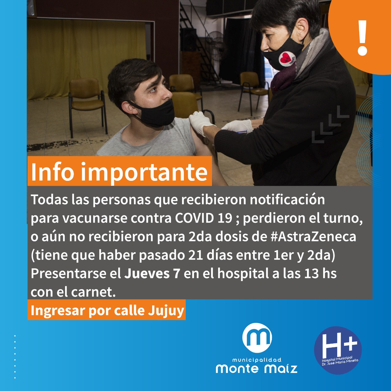 Del mismo modo, toda persona que recibió notificación para vacunarse contra COVID-19 , que perdieron el turno por algún motivo o que todavía no recibieron notificación para la segunda dosis de AstraZeneca, deben presentarse mañana, jueves 7 de octubre en el Hospital a las 13:00 hs. con el carnet de vacunación. Deberán ingresar por el patio, que da a calle Jujuy. Es importante que para que se le aplique la segunda dosis de AstraZeneca deberán haber pasado al menos 21 días desde la aplicación de la primera dosis.