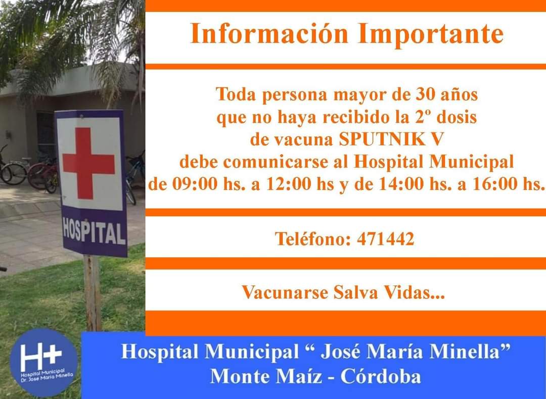 Toda persona mayor de 30 años que no haya recibido la segunda dosis de la vacuna Sputnik V debe comunicarse al Hospital Municipal de 09:00 a 12:00 y de 14:00 a 16:00 hs. Te: 471442.