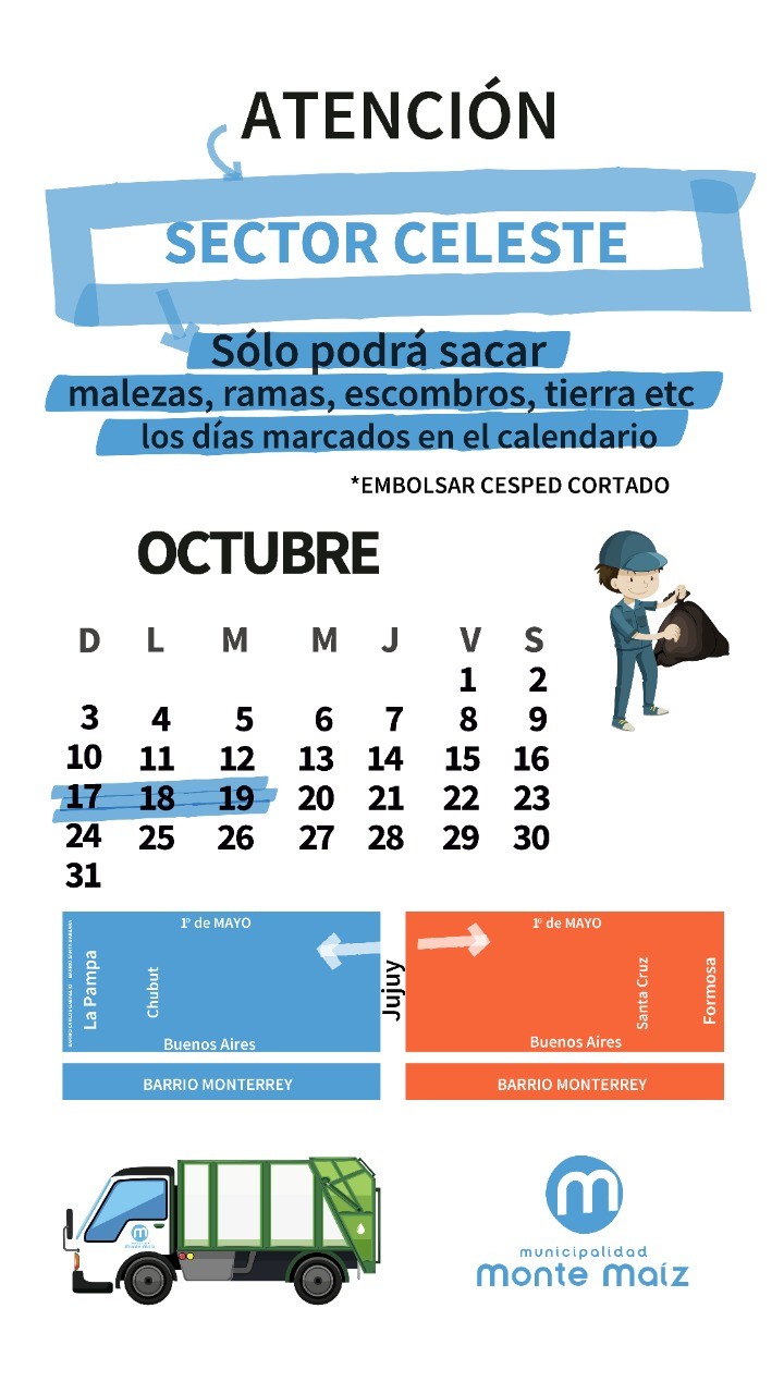La Municipalidad de Monte Maíz informa a la población que durante los días 17 al 19 de octubre solo podrán sacar la maleza los vecinos comprendidos en el denominado Sector Celeste. Desde calle Jujuy hacia calle La Pampa y desde 1° de Mayo a Misiones.