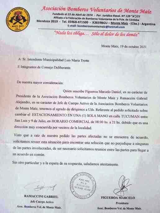 Quien suscribe Figueroa Marcelo Daniel, en su carácter de Presidente de la Asociación de Bomberos Voluntarios de Monte Maíz y Ramaccini Gabriel Alejandro, en su carácter de Jefe de Cuerpo Activo de la Asociación de Bomberos Voluntarios de Monte Maíz, tenemos el agrado de dirigirnos a ustedes, referente al pedido solicitado sobre cambiar el estacionamiento en una sola mano de calle Tucumán entre San Luis y 9 de julio, en horario comercial de 8 a 21 horas, debido a que es una dirección muy concurrida por vecinos de la localidad.