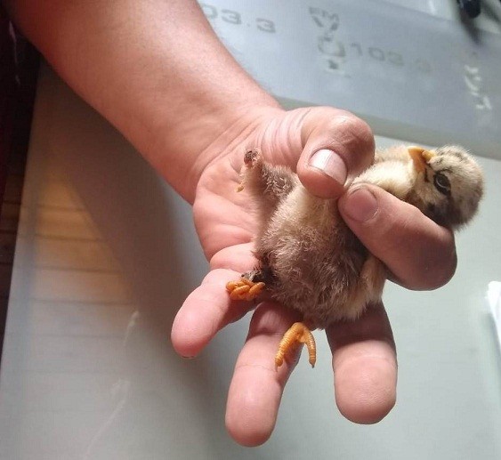 El vecino Sergio "Cuca" Bustos hizo saber y mostró un pollito que nació con tres patas, que camina normal pero que se para apoyado en la pata trasera.