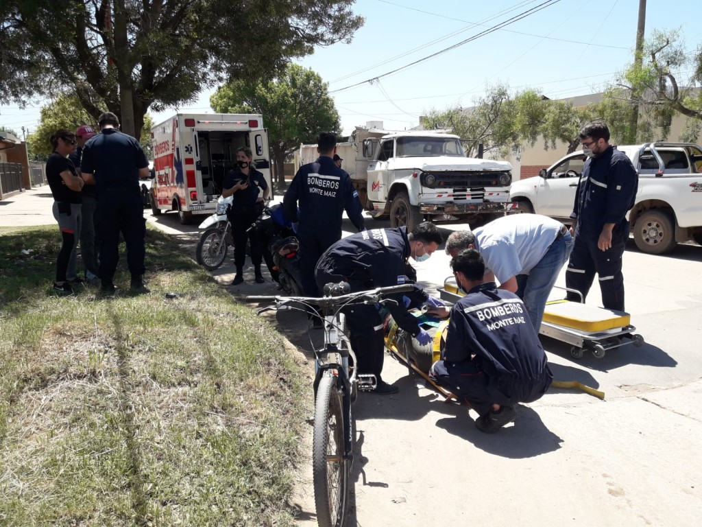A las 12:20�hs. De este martes, Bomberos Voluntarios de Monte Ma�z fueron convocados por la polic�a local a la intersecci�n de las calles San Luis y Chubut, en el Centro de nuestra localidad, por un accidente de tr�nsito protagonizado por un motociclista.