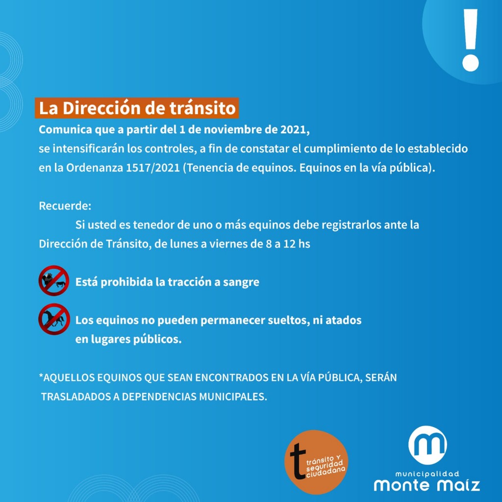 Desde la Dirección de Tránsito Municipal se informa a la población que quienes tengan caballos deberán registrarlos en la dependencia ya mencionada desde las 8 hasta las 12 hs. de lunes a viernes.