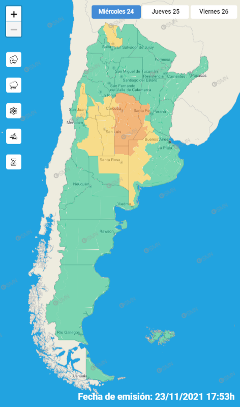 El área será afectada por tormentas fuertes o localmente severas, las cuales podrán estar acompañadas por muy fuertes ráfagas, abundante caída de agua en cortos periodos, intensa actividad eléctrica y caída de granizo. Se esperan valores de precipitación acumulada entre 40 y 80 mm, pudiendo ser superados de forma puntual.