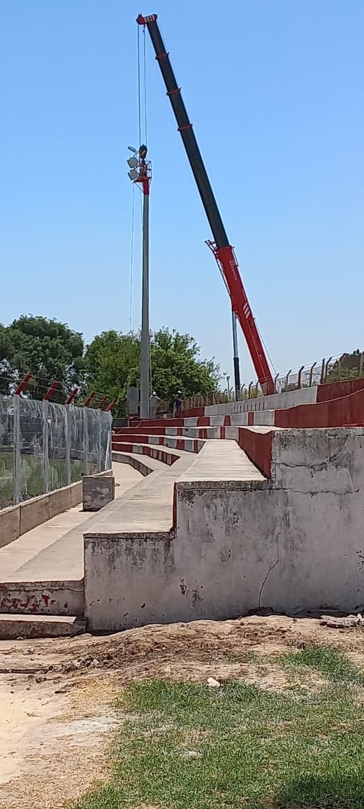 Continúan a paso firme los trabajos en el estadio del Club Atlético Lambert. Mientras continúa el proyecto de la ampliación de la tribuna local y la construcción de una cabina de transmisión, se están colocando las nuevas torres de iluminación que estarán equipadas con luminarias Led.