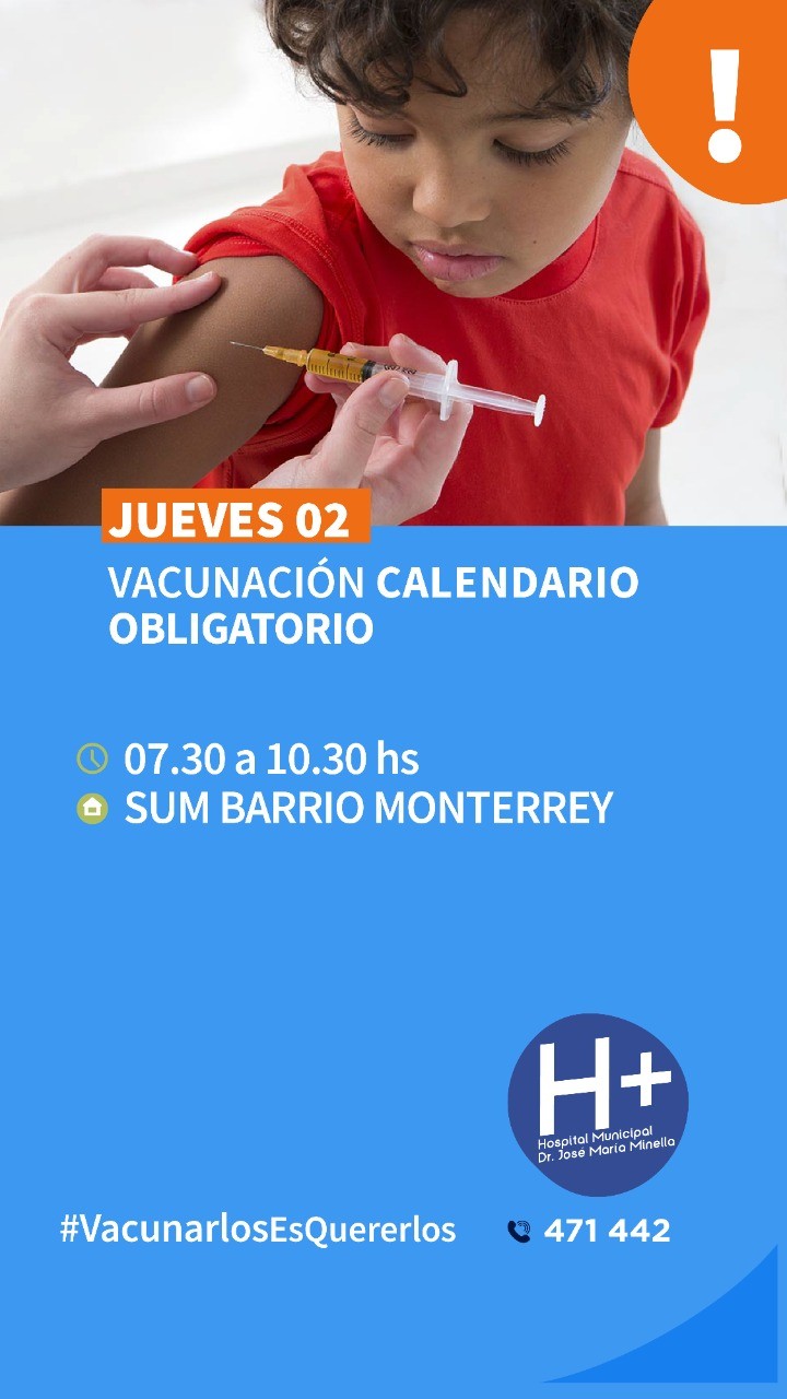 Desde el Hospital Municipal, Dr. José María Minella se informa a la población que mañana, jueves 2 de diciembre, se llevará a cabo una jornada de vacunación del calendario obligatorio en el SUM (Salón de Usos Múltiples) Madre Teresa de Calcuta de B° Monterrey.