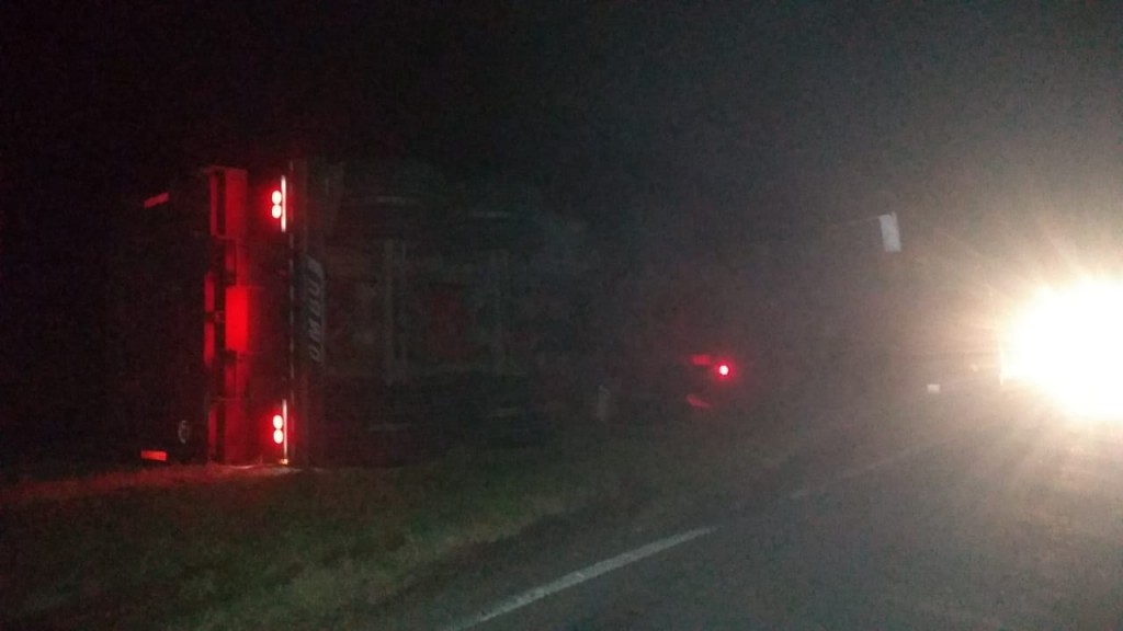 Por causas que se desconocen, el rodado mayor termina perdiendo el control, despistando y volcando. El camión que transportaba fertilizantes, era conducido por un masculino mayor de edad, que afortunadamente no presentó lesiones y ya se encontraba fuera del vehículo al momento del arribo de Bomberos Voluntarios al siniestro.