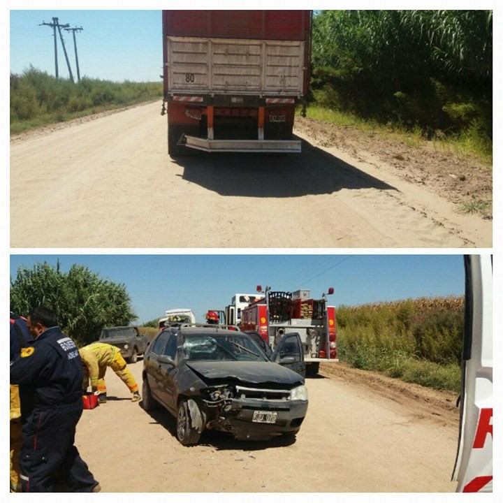 Un accidente de tránsito tuvo lugar en el camino a Colonia Barge, a unos 2 kms. hacia el sur de nuestra localidad, entre un automóvil Fiat Palio, Dominio FJU 070, conducido por el joven Ezequiel Retamal de 18 años de edad, domiciliado en Colonia Barge. Impactó en la parte trasera de un camión Mercedes Benz 1114, Dominio UTG 931, con acoplado UKZ 653, conducido por el Señor Damián Alejandro Delsoglio de 32 años de edad con domicilio en calle España N° 153 de la localidad de Isla verde.