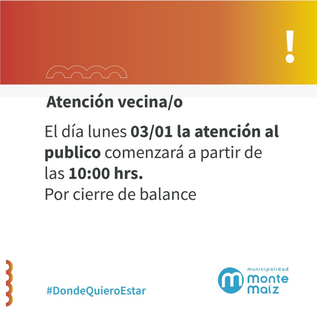 La Municipalidad de Monte Maíz informa a la población que el día lunes 3 de enero de 2022 la atención al público comenzará a partir de las 10:00 hs. por cierre de balance.