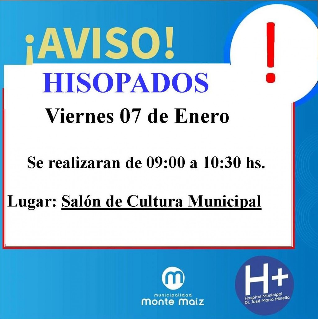 Desde el Hospital Municipal se informa a la poblaci�n que hoy viernes, 7 de enero de 2022, se practicar�n hisopados de 9:00 a 10:30 hs. en la Casa de la Cultura.