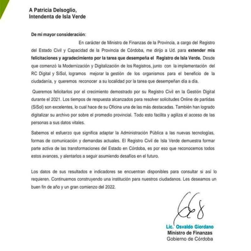 Quien se refirió al tema fue Luciana Gambarotto, encargada del Registro Civil de Isla Verde, quien en diálogo con la periodista Maricel Ridolfi de Estación 95.1 explicó que la nota la recibió el 21 de diciembre a su correo electrónico, dirigida a la Intendente Patricia Delsoglio, ya que es jefa natural del Registro Civil, de parte del Ministro de Finanzas Lic. Osvaldo Giordano.
