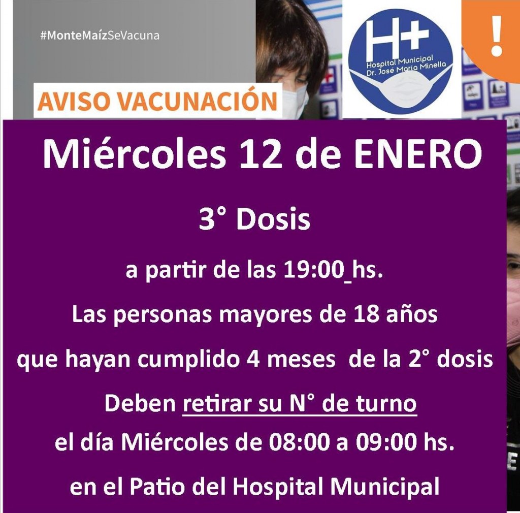 Mañana miércoles 12 de enero se vacunará con terceras dosis a personas mayores de 18 años que hayan cumplido con 4 meses desde la segunda dosis. La vacunación será a las 19:00 hs. Pero se deben retirar turnos por la mañana de 8 a 9 hs. en el patio del hospital.