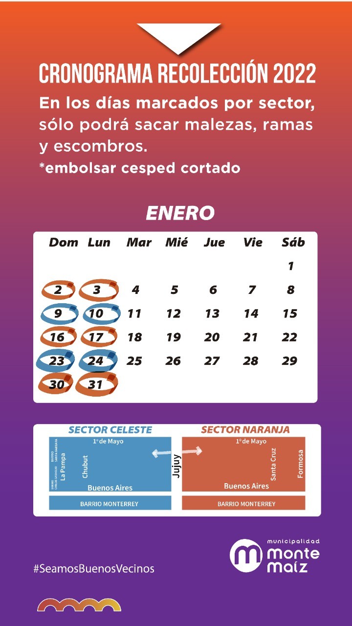 Este domingo y lunes 16 y 17 de enero podrán sacar malezas, ramas y escombros los vecinos del sector Naranja. Se solicita a la población que embolse el césped cortado para que sea más fácil y ágil su recolección.