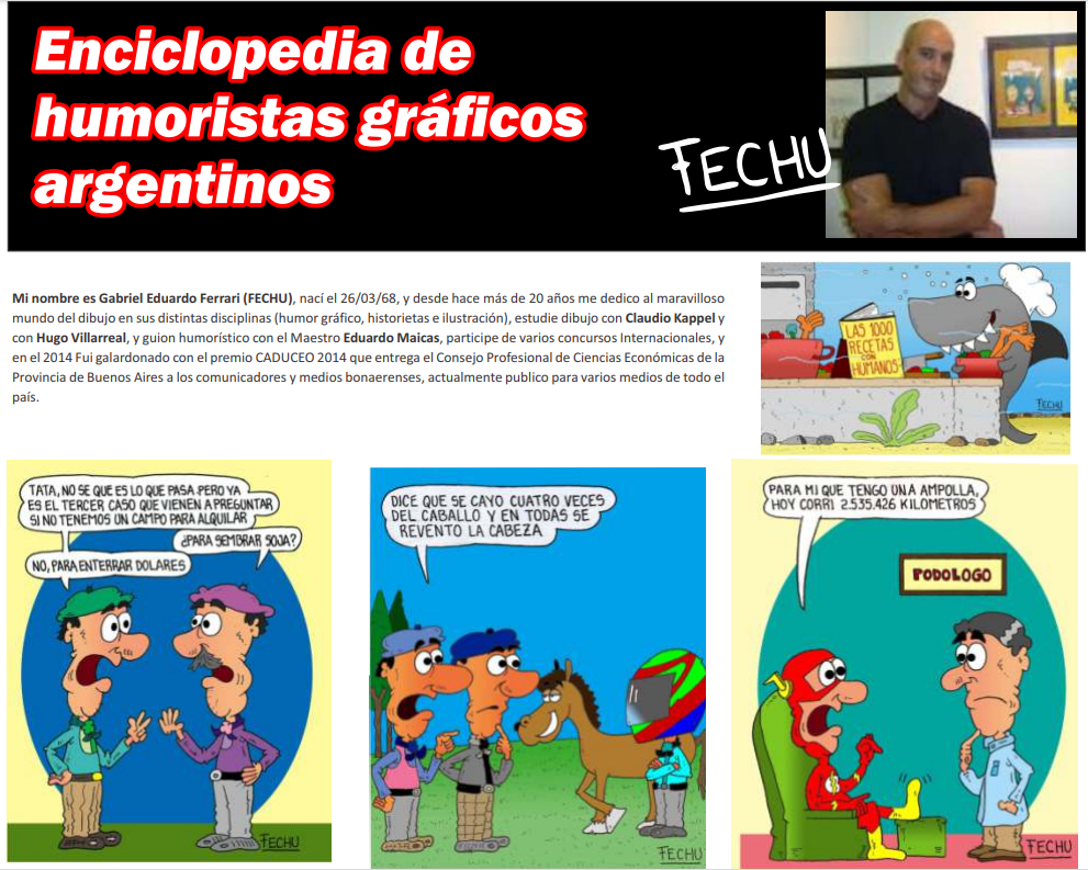 “Mi nombre es Gabriel Eduardo Ferrari (FECHU), nací el 23/03/68, y desde hace más de 20 años me dedico al maravilloso mundo del dibujo en sus distintas disciplinas (humor gráfico, historietas e ilustración), estudié dibujo con Claudio Kappel y con HugoVillarreal y guión Humorístico con el maestro Eduardo maicas, participé de varios concursos internacionales, y en el 2014 fui galardonado con el premio CADUCEO que entrega el Concejo Profesional de Ciencias Económicas de la provincia de Buenos Aires a los comunicadores y Medios bonaerenses, actualmente publico para varios Medios de todo el país”.