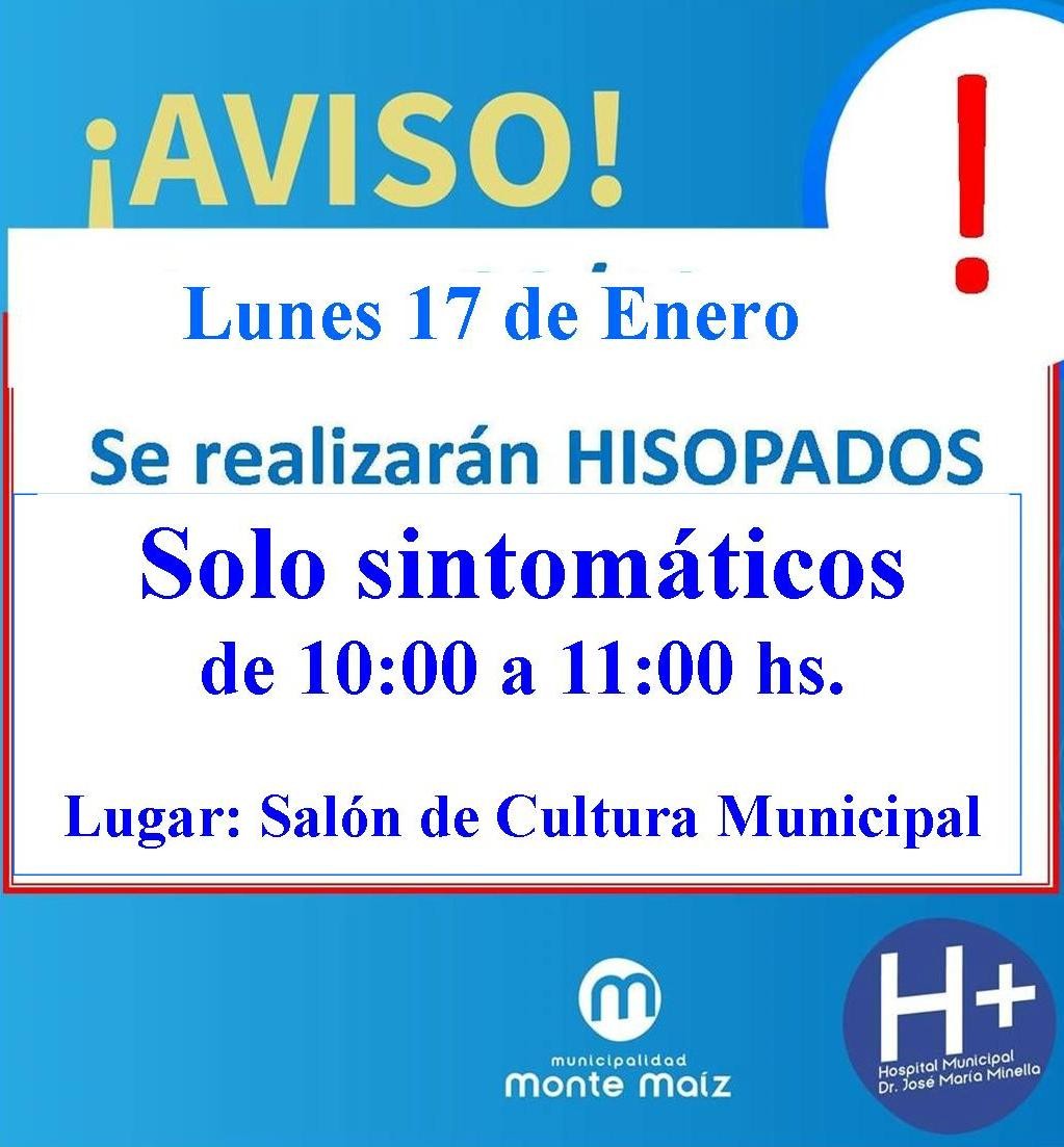 Desde el Hospital Municipal se informa a la población que mañana lunes 17 de enero se realizarán hisopados solo a personas con síntomas, desde las 10 a las 11 hs. en la Casa de la Cultura.