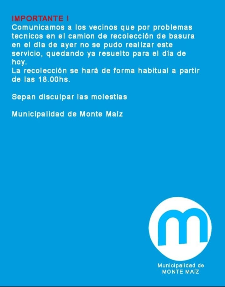 La Municipalidad de Monte Maíz comunica a la población que en el día de ayer no se pudo hacer la recolección de residuos domiciliarios por problemas mecánicos en el camión.