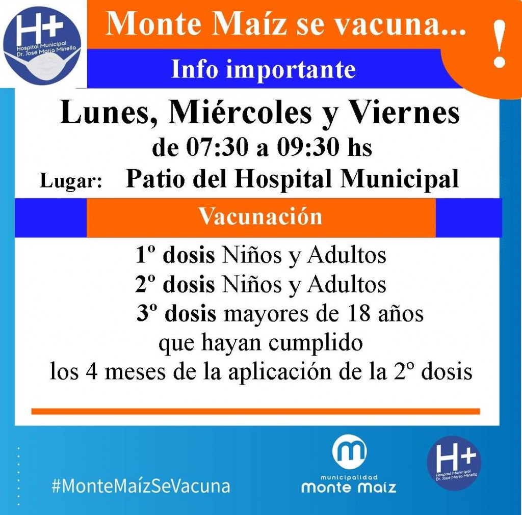 El Hospital Municipal informa a la población que hoy lunes, el miércoles y el viernes habrá vacunación de COVID-19 desde las 07:30 hs. hasta las 09:30 hs.