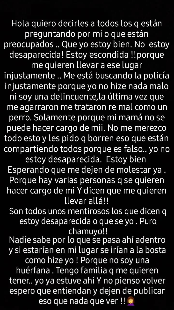 Pidió también que dejaran de compartir el comunicado de la Fiscalía de Bell Ville donde se pide su búsqueda.