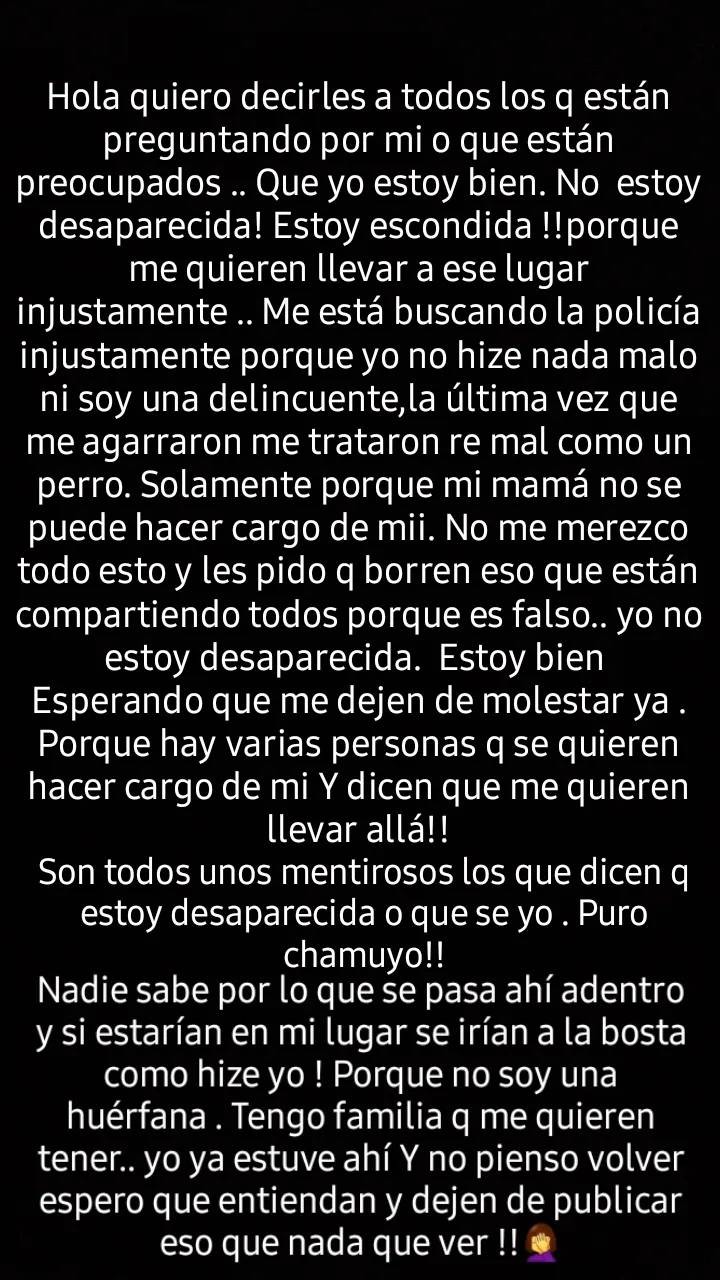 Tras el pedido de datos para dar con el paradero de Salette Ferrer, la adolescente de 15 años de Marcos Juárez que estaba en el Instituto Residencia de Wenceslao Escalante y que se habría escapado, apareció un comunicado de la joven diciendo que no está desaparecida sino que está escondida y en buen estado de salud.