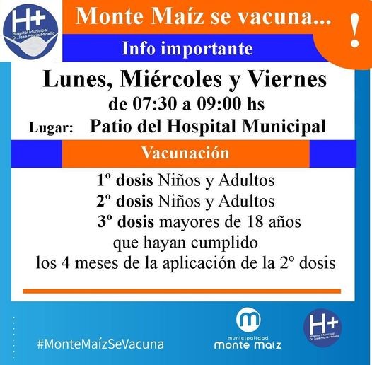 Desde el Hospital Municipal se informa a la población que continúa la campaña de vacunación COVID-10 los días lunes, miércoles y viernes en el patio del Hospital desde las 07:30 a 09:00 hs.