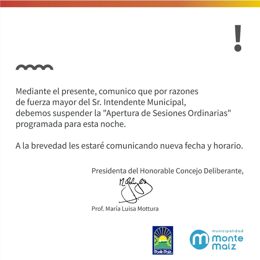 La Presidenta del Honorable Concejo Deliberante de Monte Maíz, María Luisa Mottura, informó en horas del mediodía que por razones de fuerza mayor del Intendente Municipal, Dr. Luis Maria Trotte, debía suspender la apertura de sesiones ordinarias 2022, programada para esta noche. En breve se informará la fecha de reprogramación.