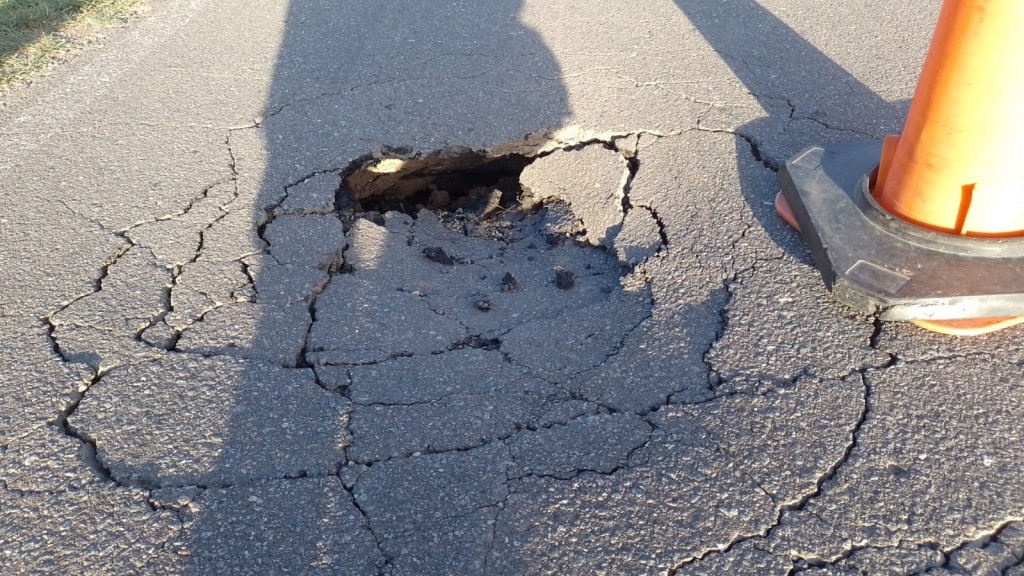 En el lugar hay una alcantarilla que se habría roto, filtrando agua y socavando el terreno y ocasionando un cráter en la carpeta asfáltica. Personal de la policía caminera procedió a señalizar el lugar hasta tanto se haga presente personal de la Dirección provincial de Vialidad para evaluar los daños.