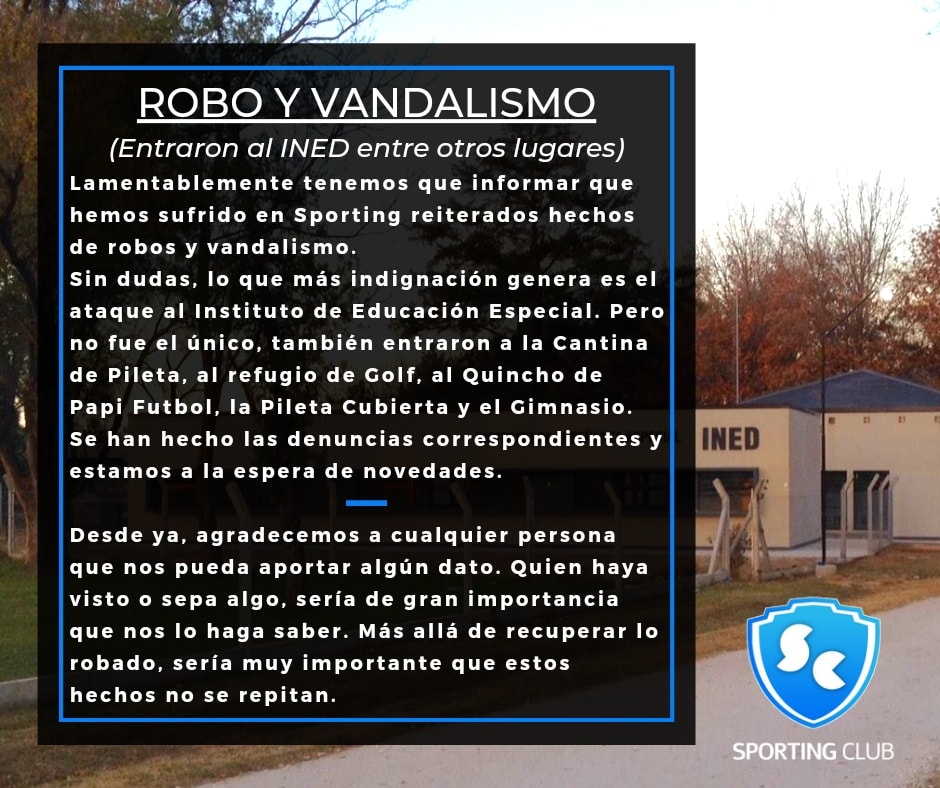 El Sporting Club de Corral de Bustos denunció a través de su cuenta de Facebook que la institución ha sufrido una serie de hechos de vandalismo y de robo.