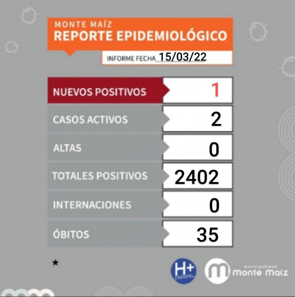 El Reporte epidemiológico local arrojó un nuevo caso de COVID19 en Monte Maíz. De esta manera, se contabilizan 2.402 casos desde el comienzo de la pandemia y 35 personas fallecidas a causa de la enfermedad.