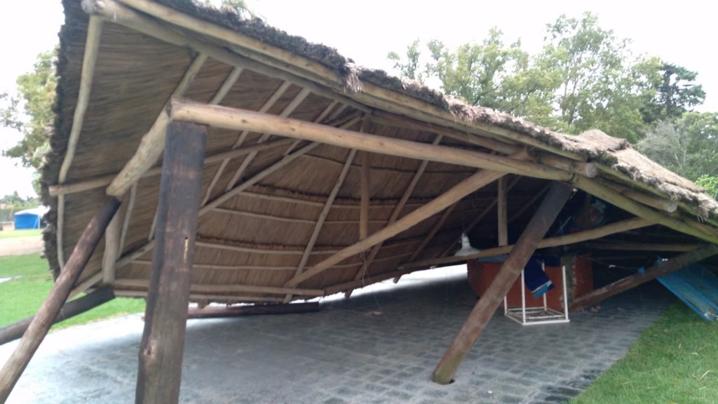 Los fuertes vientos que soplaron hoy en la localidad provocaron distintos destrozos, entre ellos la rotura del quincho de la pileta del Club Chañarense en su totalidad.