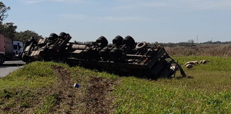 Un camión jaula que transportaba cerdos volcó en la mañana del lunes en ruta 9 entre Marcos Juárez y genera Roca; a unos 6 kms. de esta última localidad.