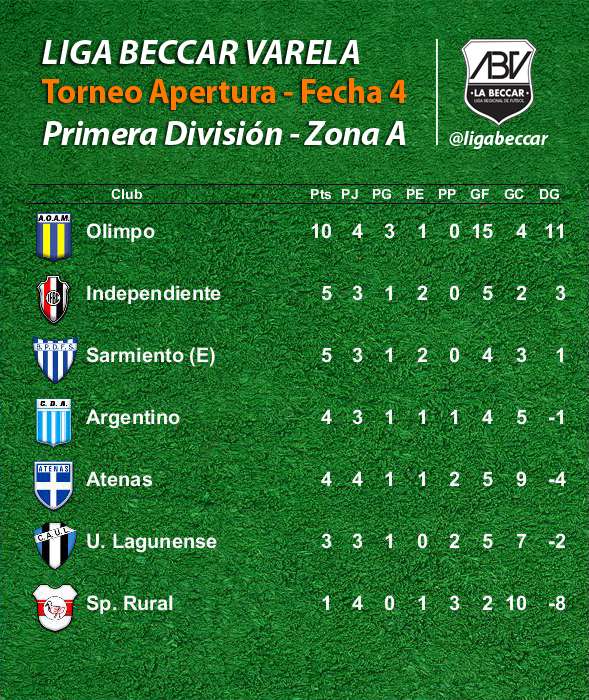 Olimpo venció a Atenas y llegó a la punta de la Zona A, donde Sarmiento (E) y Unión Lagunense empataron. Jorge Newbery y Talleres lideran la zona B con sus triunfos sobre Sportivo Chazón y Guillermo Renny.