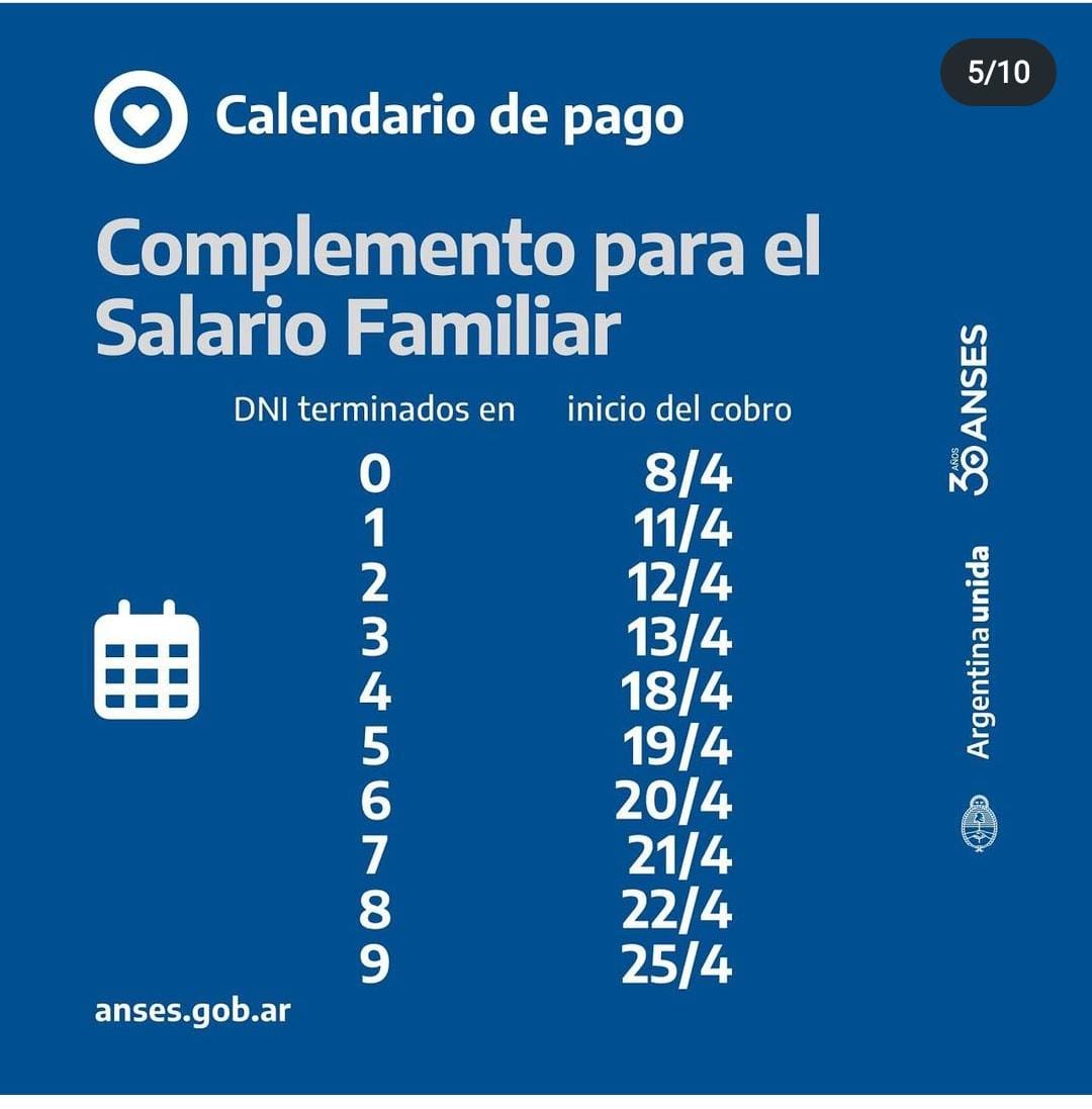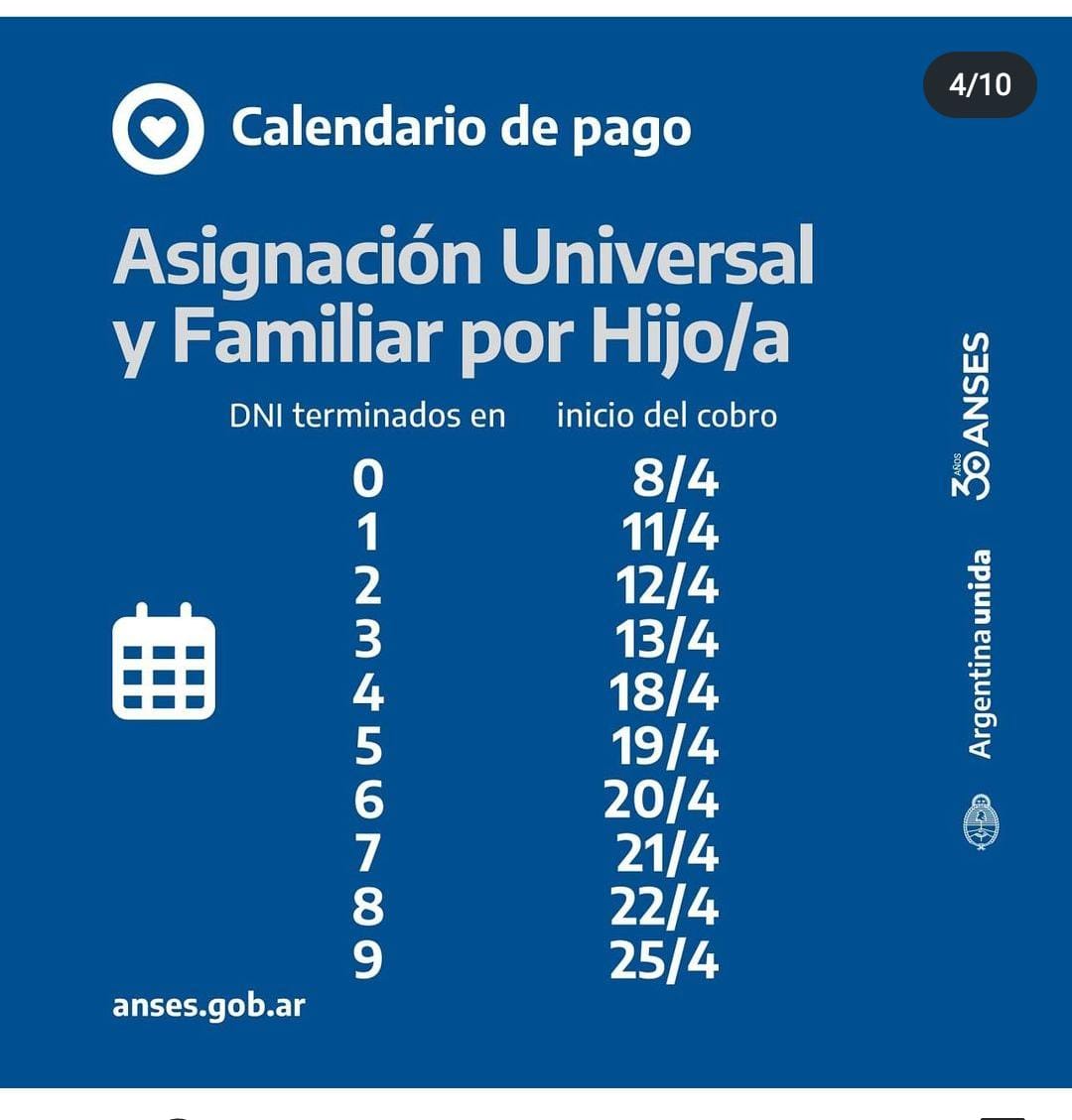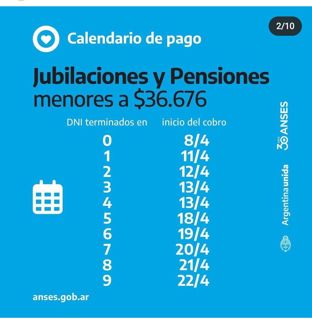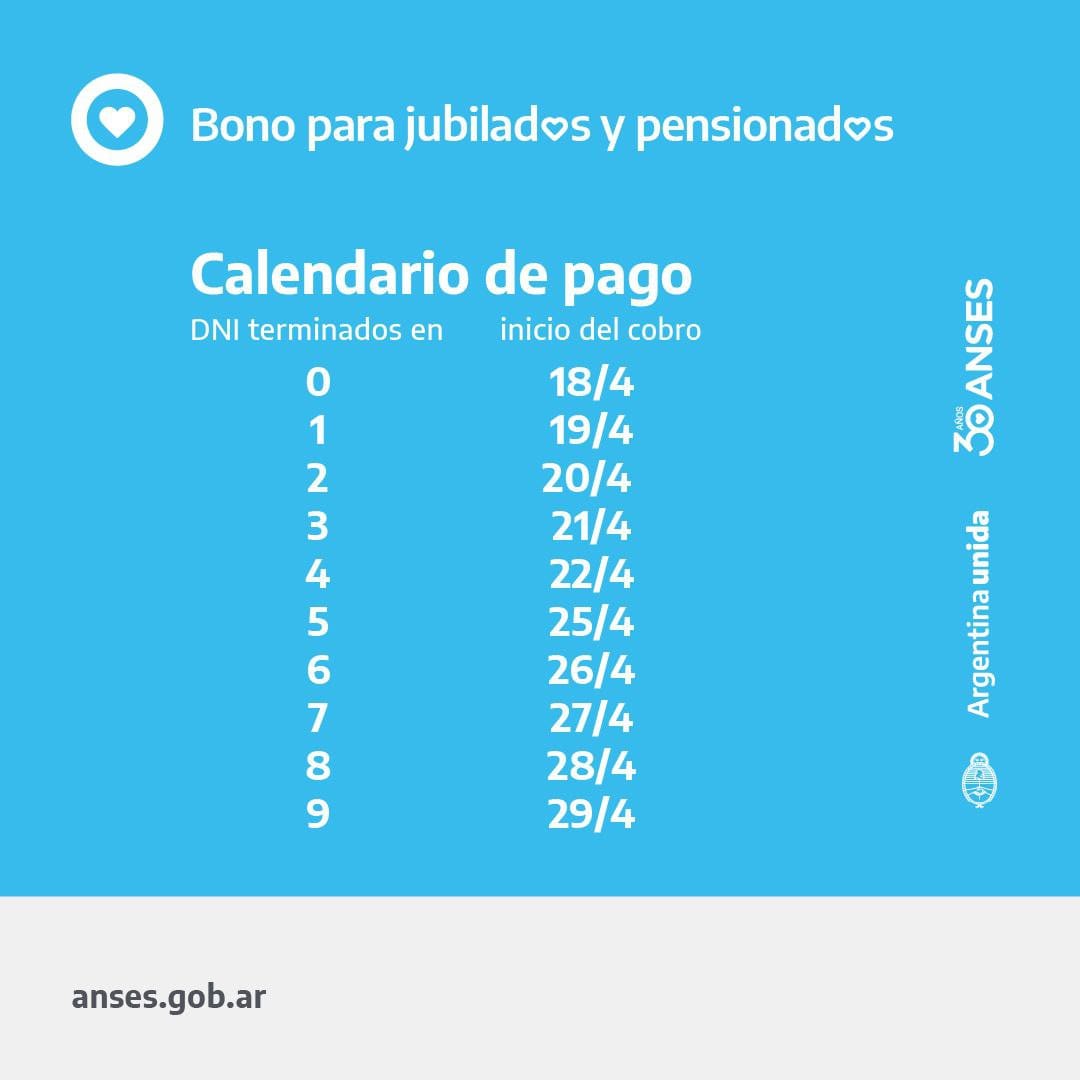 Se abonará los días hábiles según terminación de DNI a partir del 18 de abril: