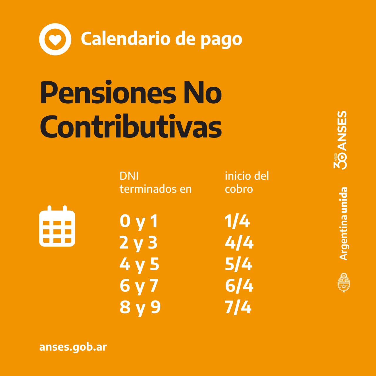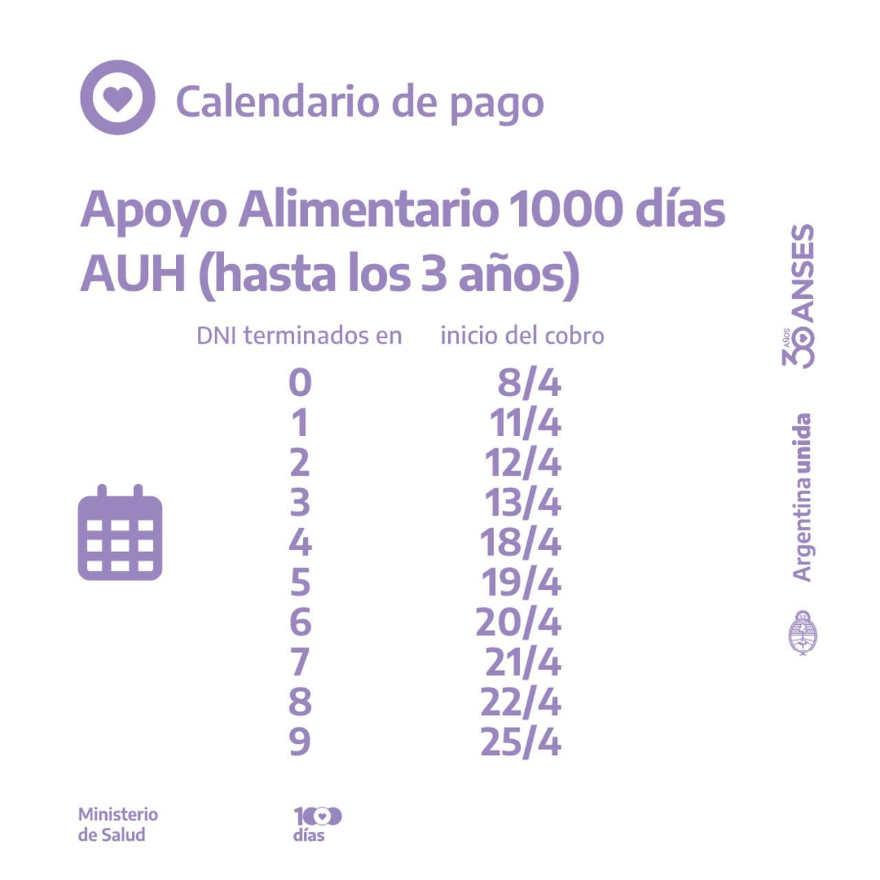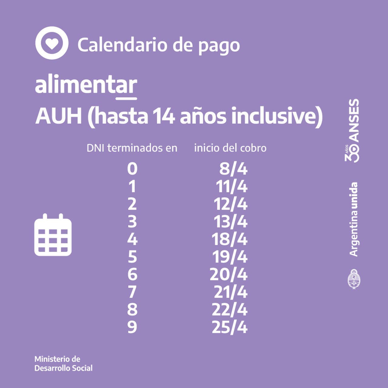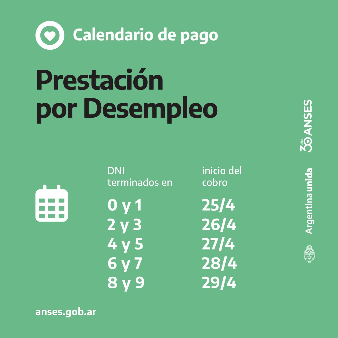 Se abonará los días hábiles según terminación de DNI a partir del 18 de abril: