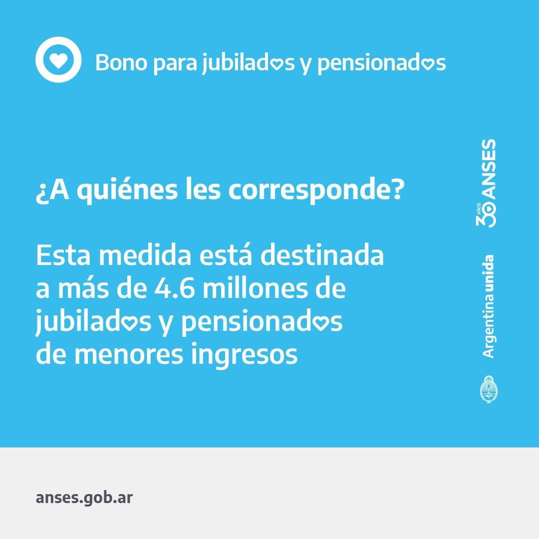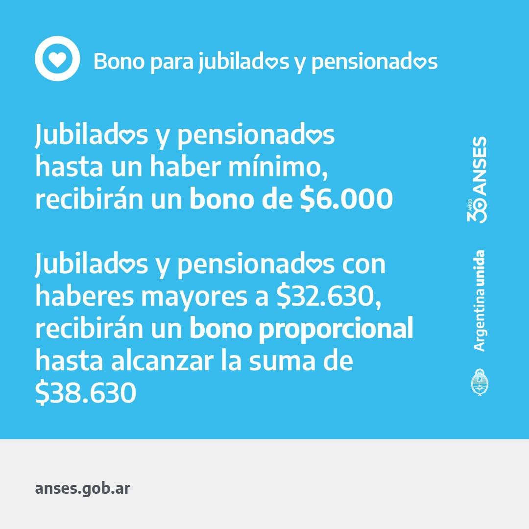 La medida alcanza a un total de 4,6 millones de personas. Será un bono de $6.000 para jubilados y pensionados que perciban ingresos hasta un haber mínimo ($32.630). Quienes tengan ingresos entre $32.630 y $38.630, recibirán la diferencia hasta completar este último monto.