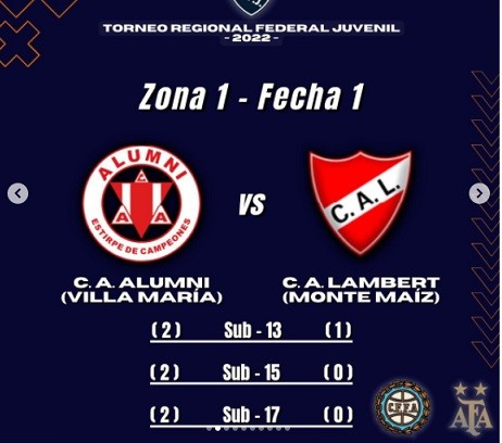 Por la primera Fecha del Torneo Regional Federal Juvenil, Lambert de Monte Maíz viajó a Villa María para enfrentar a Alumni de esa ciudad con los siguientes resultados: