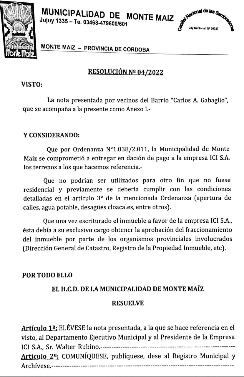 En sesión ordinaria del Honorable Concejo Deliberante de Monte Maíz se aprobó por unanimidad la Resolución N° 04/2022 en la que se eleva una nota de los vecinos de B° Carlos Gabaglio, ex IVECOR, al Ejecutivo Municipal y al Presidente de la empresa ICI S.A., Sr. Walter Rubino.