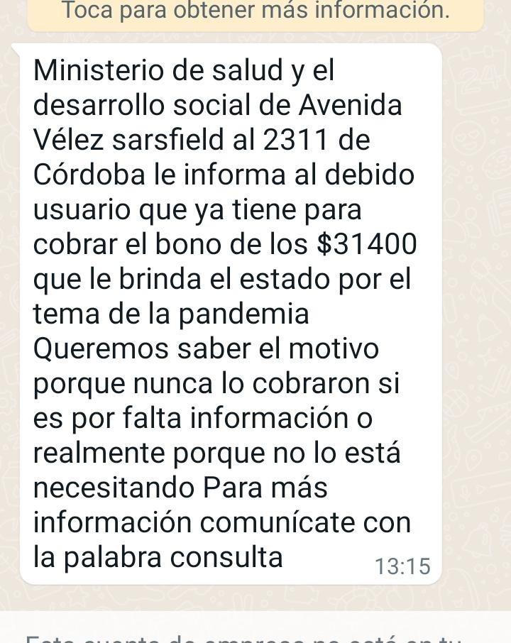Por estas horas está circulando un mensaje de whatsapp que informa sobre el cobro de un bono de $13.400 del Ministerio de Salud y Desarrollo Social de la ciudad de Córdoba.