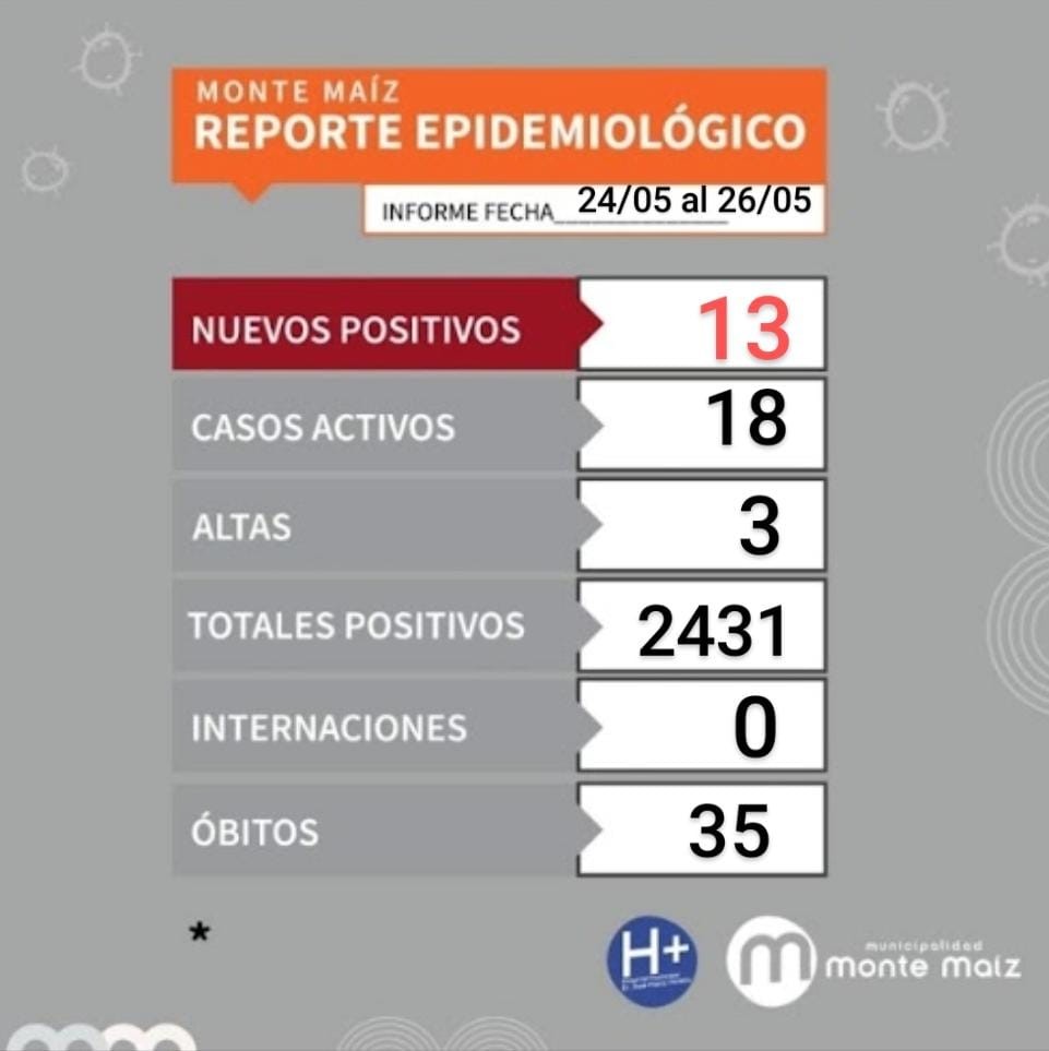 13 CASOS NUEVOS DE COVID-19 EN MONTE MAÍZ