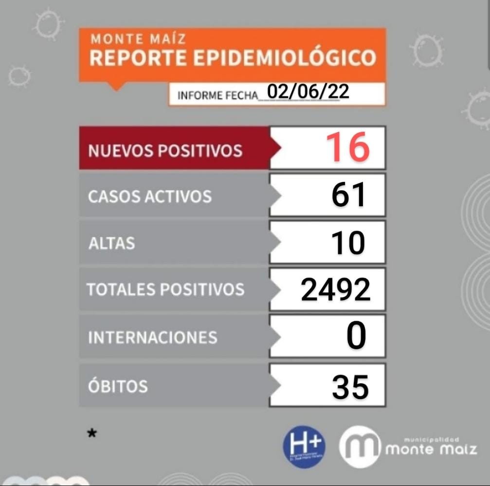 Se confirmaron 16 casos nuevos de COVID-19 en Monte Maíz y se dieron 10 altas médicas a pacientes que cursaban la enfermedad.
