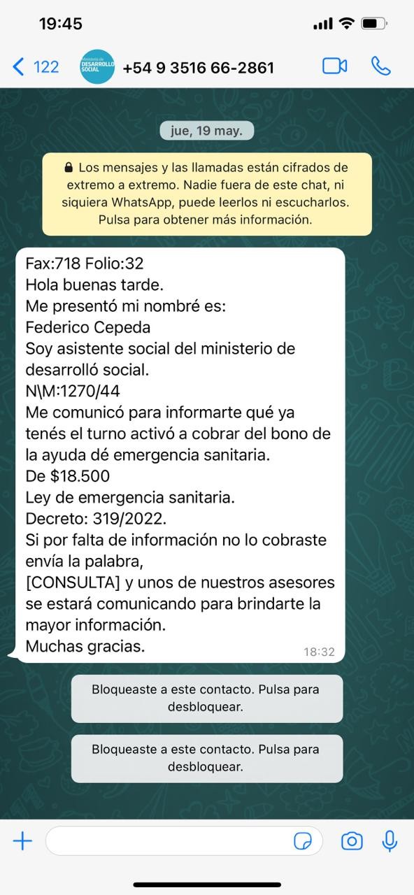 Fue así que, sabiendo que se trataba de una posible estafa, accedió a brindar algunos datos -aunque falsos- y de esta manera los pudo desenmascarar. Pues no hay ningún bono por ese monto de dinero y, en todo caso, no es la manera habitual de ser otorgado. Solo se recibe un bono cuando se anuncia por el Gobierno y los beneficiarios siguen los pasos correspondientes vía medios de contacto oficiales como la página de ANSES.