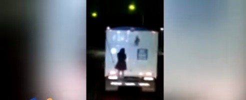 IMAGEN DE UNA MUJER COLGADA EN LOS ESTRIBOS DE UN CAMIÓN MIENTRAS CORCULABA