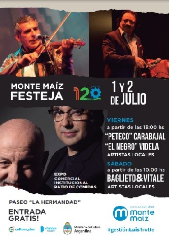 Esteban Sánchez, del Departamento de Cultura Municipal, confirmó que Peteco Carabajal estará también en los festejos por los 120 años de Monte Maíz. Este artista destacado del folclore argentino llega a través del Ministerio de Cultura de la Nación. Actuará el viernes 1° de julio a las 16 hs. el mismo día en el que habrá una importante grilla de artistas locales que cerrará el Negro Ángel Videla, quien llega a través de la Agencia Córdoba Cultura.