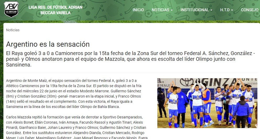 Argentino de Monte Maíz, el equipo sensación del torneo Federal A, goleó 3 a 0 a Atlético Camioneros por la 15ta fecha de la Zona Sur. El partido se disputó en la fría noche del miércoles 22 de junio en el estadio Modesto Marrone. Guillermo Sánchez (8m) y Cristian González (30m) -penal- marcaron en la etapa inicial, y Franco Olmos (14m) selló el resultado en el complemento. Con esta victoria, el Raya iguala a Sansinena en la línea de los escoltas del líder Olimpo de Bahía Blanca.