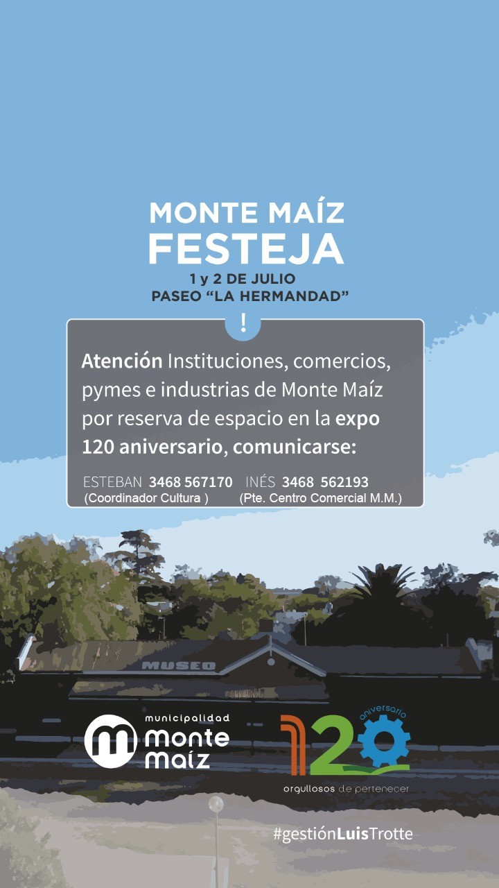 En el marco dela celebración de los 120 años de Monte Maíz, se llevará a cabo una gran muestra y exposición de industrias y empresas de nuestro pueblo en el predio del ferrocarril.