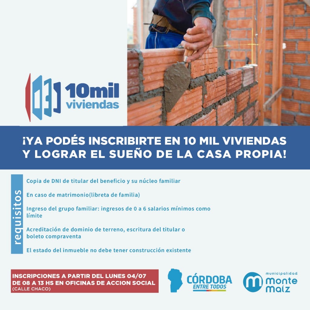 El área de Desarrollo Social de la Municipalidad de Monte Maíz informa a la población que se abren las inscripciones para el Programa “10.000 Viviendas” del Gobierno provincial.