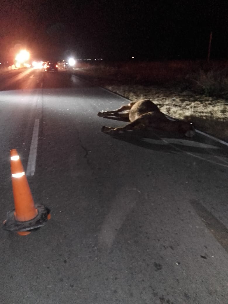 Se recibe llamado alertando sobre un accidente entre un auto y un equino. Al arribo se constata que la única ocupante del rodado se encontraba fuera del mismo con contusiones leves, procediendoce a la inmovilizacion y posterior traslado al hospital. En tanto, el equino se encontraba sin vida sobre la ruta obstaculizando el total de una mano, procediendoce al control de trafico y posterior remoción del mismo.
