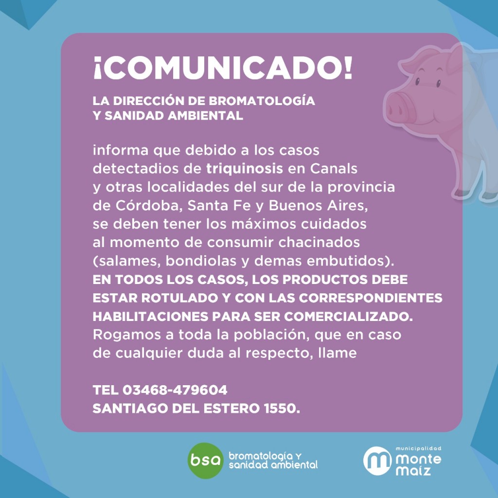 La Dirección de Bromatología y Sanidad Ambiental de la Municipalidad de Monte Maíz, informa que debido a los casos detectados de triquinosis en Canals y otras localidades del sur de la provincia de Córdoba, Santa Fe y Buenos Aires, se deben tener los máximos cuidados al momento de consumir chacinados (salames, bondiolas y demas embutidos).
