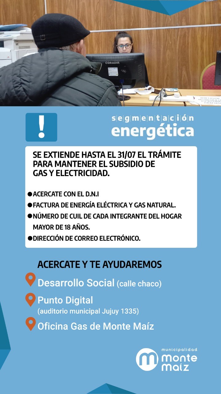 El gobierno nacional prorrogó hasta el 30 de julio la fecha para llenar el formulario on line para mantener el beneficio del subsidio al gas y a la luz. Con lo cual se invita a los vecinos que no han podido hacer el trámite a acercarse a la oficina de Desarrollo Social, calle Chaco casi esquina Salta de B° Monterrey; a Punto Digital, en el auditorio municipal y/o a la oficina de Gas de Monte Maíz S.A.